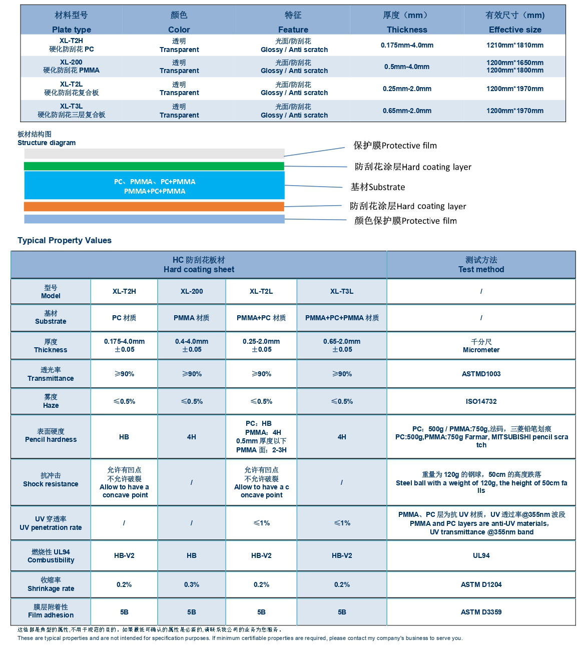 XL-T2H 防刮花PC优点耐刮花、耐候耐腐蚀、抗冲击、韧性好, 可应用于对硬度要求较低的产品,如功能机镜片、小家电面板、防护眼镜、安防面板和电梯户外广告牌等